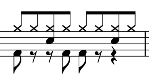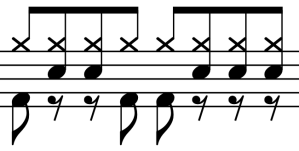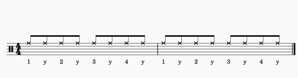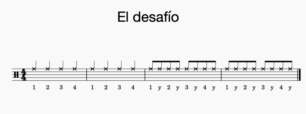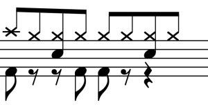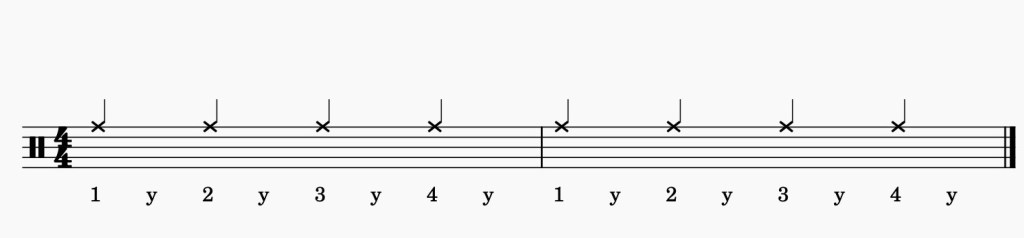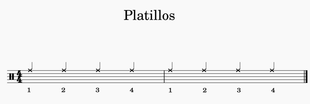 Empezamos con el platillo (ride) con la mano derecha y golpeando con la cabeza de la baqueta.